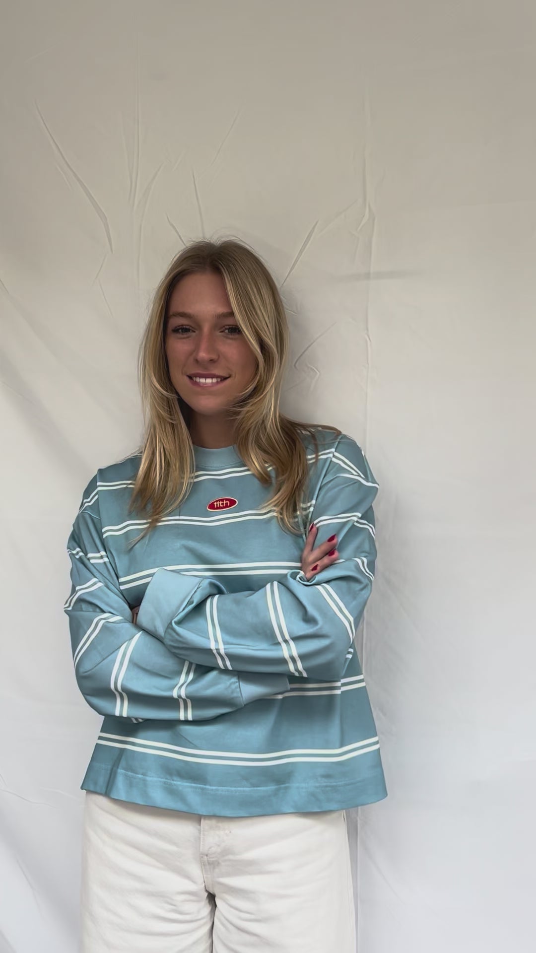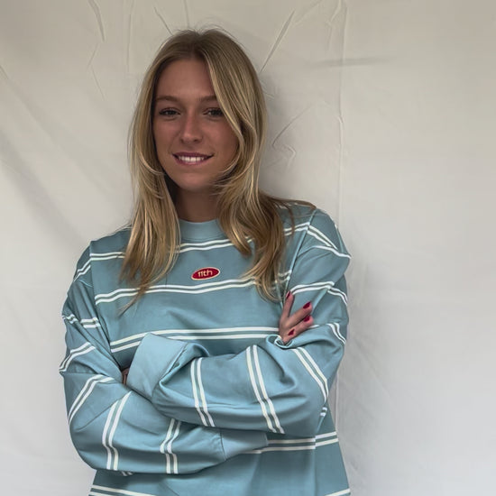 Deze blauwe longsleeve heeft de perfecte wide fit! De longsleeve is van heerlijk stevige en zware kwaliteit, zodat deze mooi in model blijft. De mouwen zijn afgewerkt met net wat dikkere boordjes. De dubbele strepen zijn in een off white kleur. Het kleine logo voorop is er als patch op geborduurd.