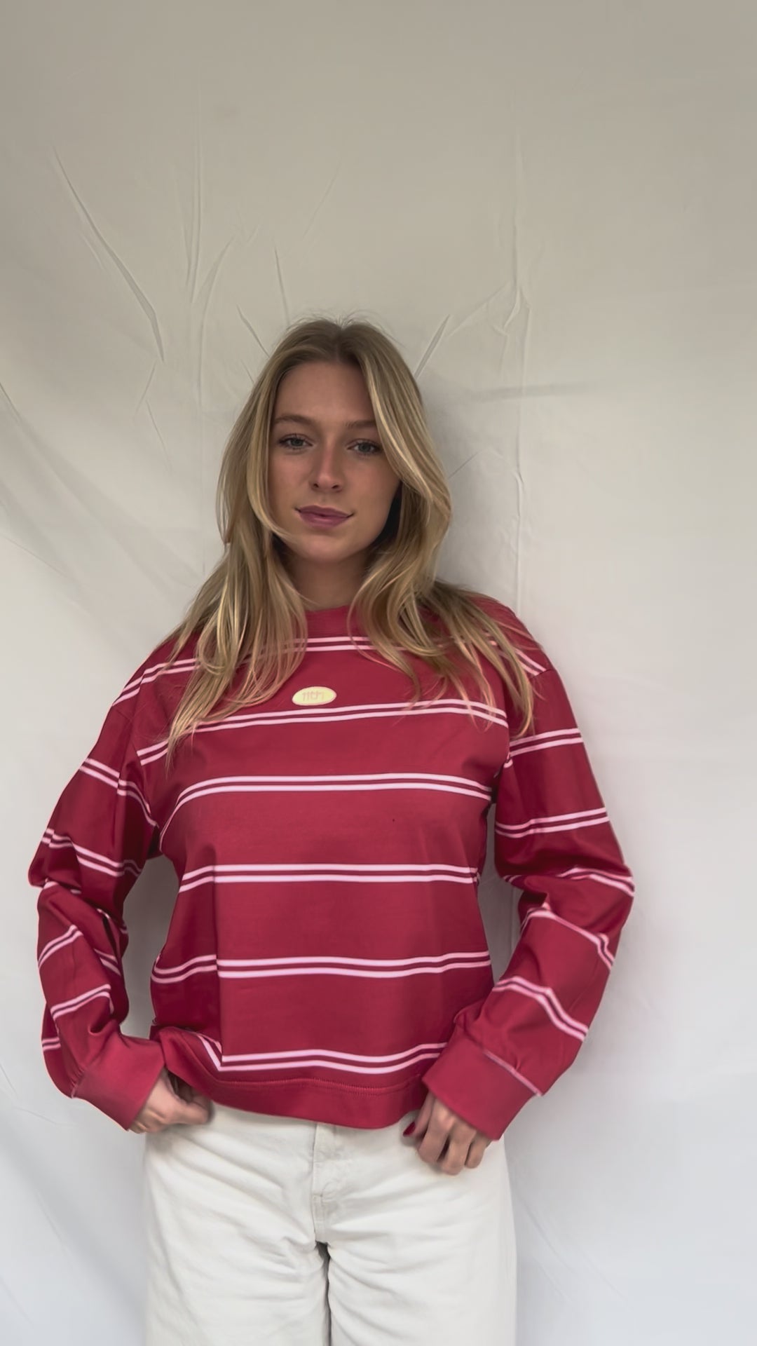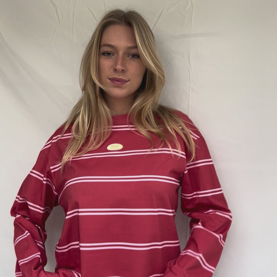 Deze rode longsleeve heeft de perfecte wide fit! De longsleeve is van heerlijk stevige en zware kwaliteit, zodat deze mooi in model blijft. De mouwen zijn afgewerkt met net wat dikkere boordjes. De dubbele strepen zijn in een licht roze kleur. Het kleine logo voorop is er als patch op geborduurd.